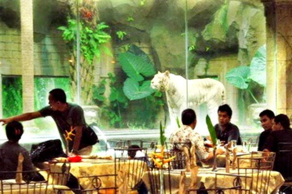 Taman Safari Prigen Memiliki Tiger Cave Restaurant. Apa kehebatan restoran ini? Tentu saja sangat menarik karena Anda akan dapat menikmati hidangan istimewa ditemani para harimau putih di balik dinding kaca. Apakah bahaya? Tentu saja tidak, keselamatan Anda terjamin karena lapisan dinding kacanya sangat tebal sehingga tak perlu khawatir dengan kemungkinan “hewan-hewan gagah” tersebut menyerang Anda. Silahkan menikmati menu chicken steak ataupun beaf steak sebagai hidangan favorit disana sambil menyapa harimau putih di sekeliling Anda dengan keceriaan bersama keluarga. Wah, kebayang asyiknya kan?